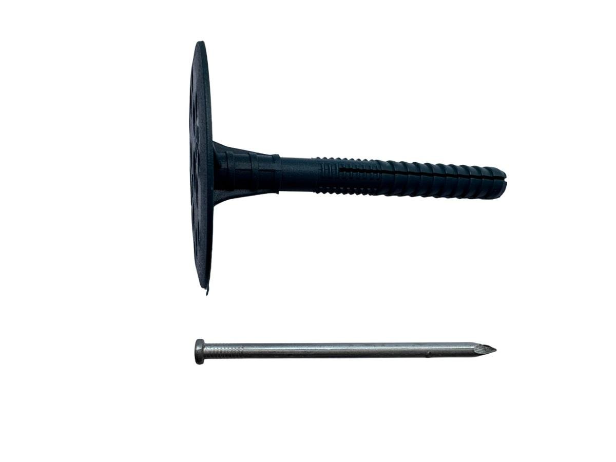 Используется для крепления теплоизоляционных материалов к бетону, полнотелому и пустотелому кирпичу, камню, пенобетону. Состоит из дюбеля с двухсегментной распорной частью, имеющего увеличенную прижимную шайбу диаметром 60мм и гвоздя. Установка производится методом сквозного монтажа, крепление в стене производится забиванием стального гвоздя. Металлический гвоздь позволяет монтировать тяжелые виды утеплителя.